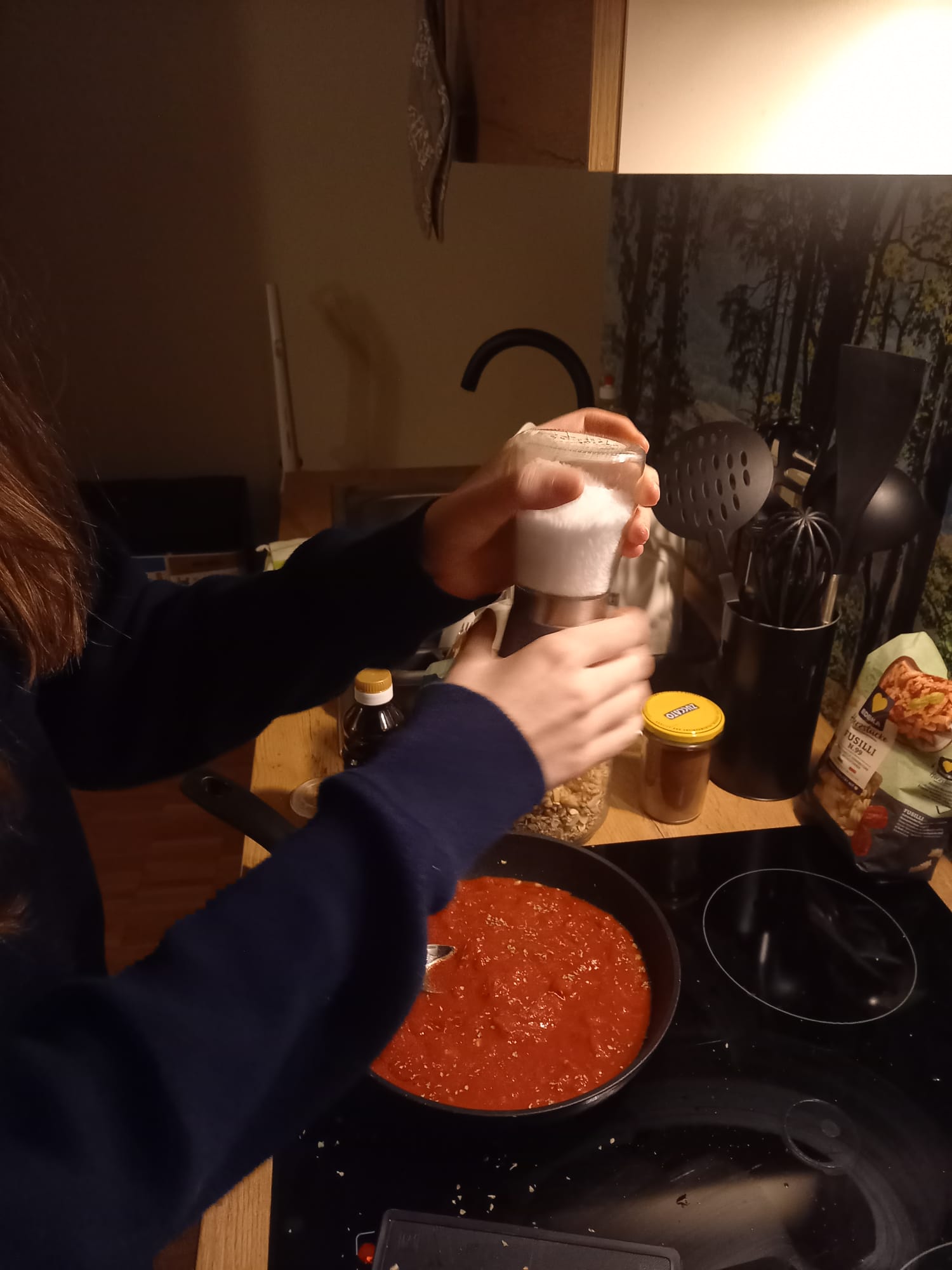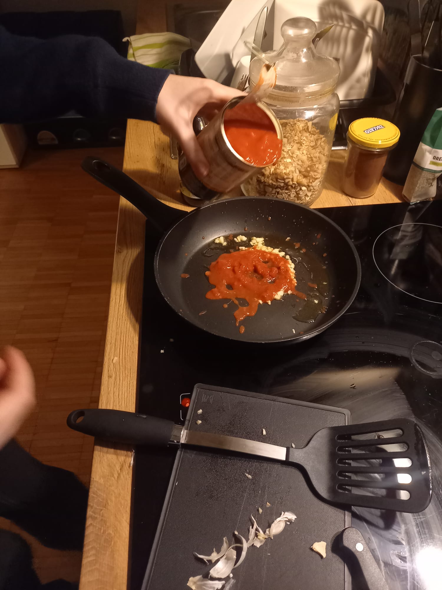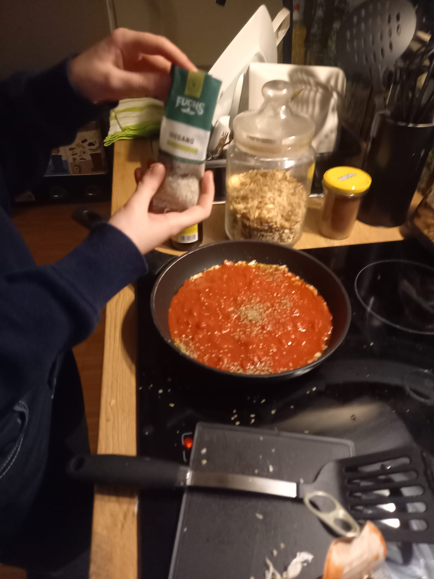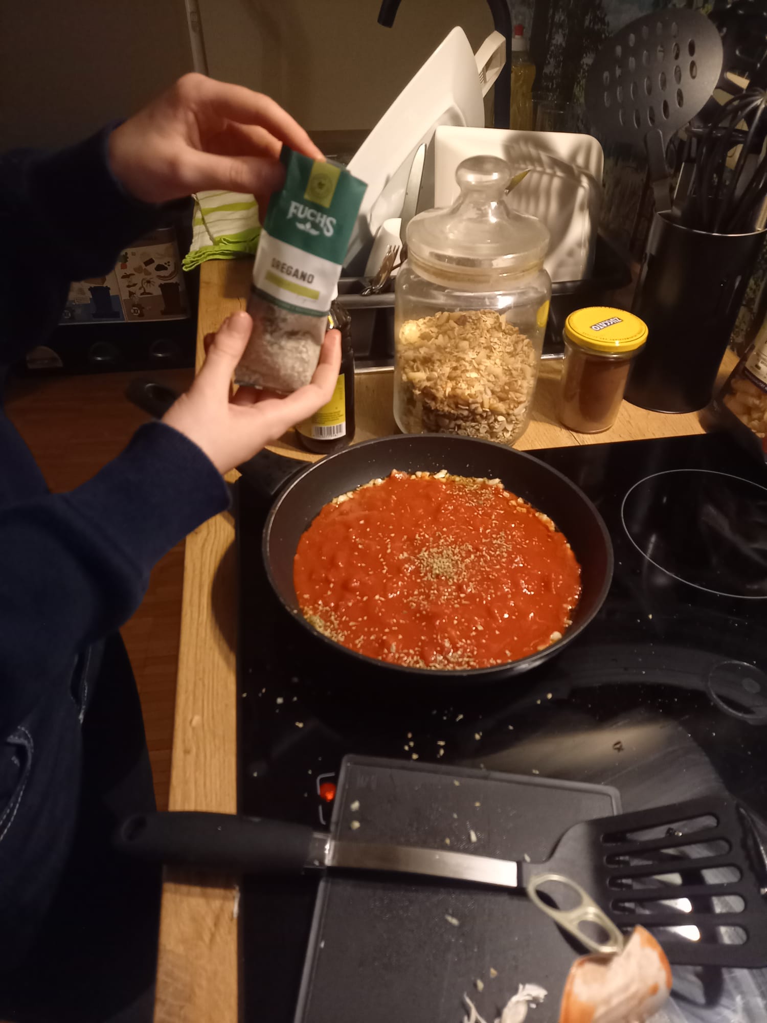 - Pour in the chopped tomatoes, dried oregano, and the optional honey/maple syrup. Season with salt and pepper.