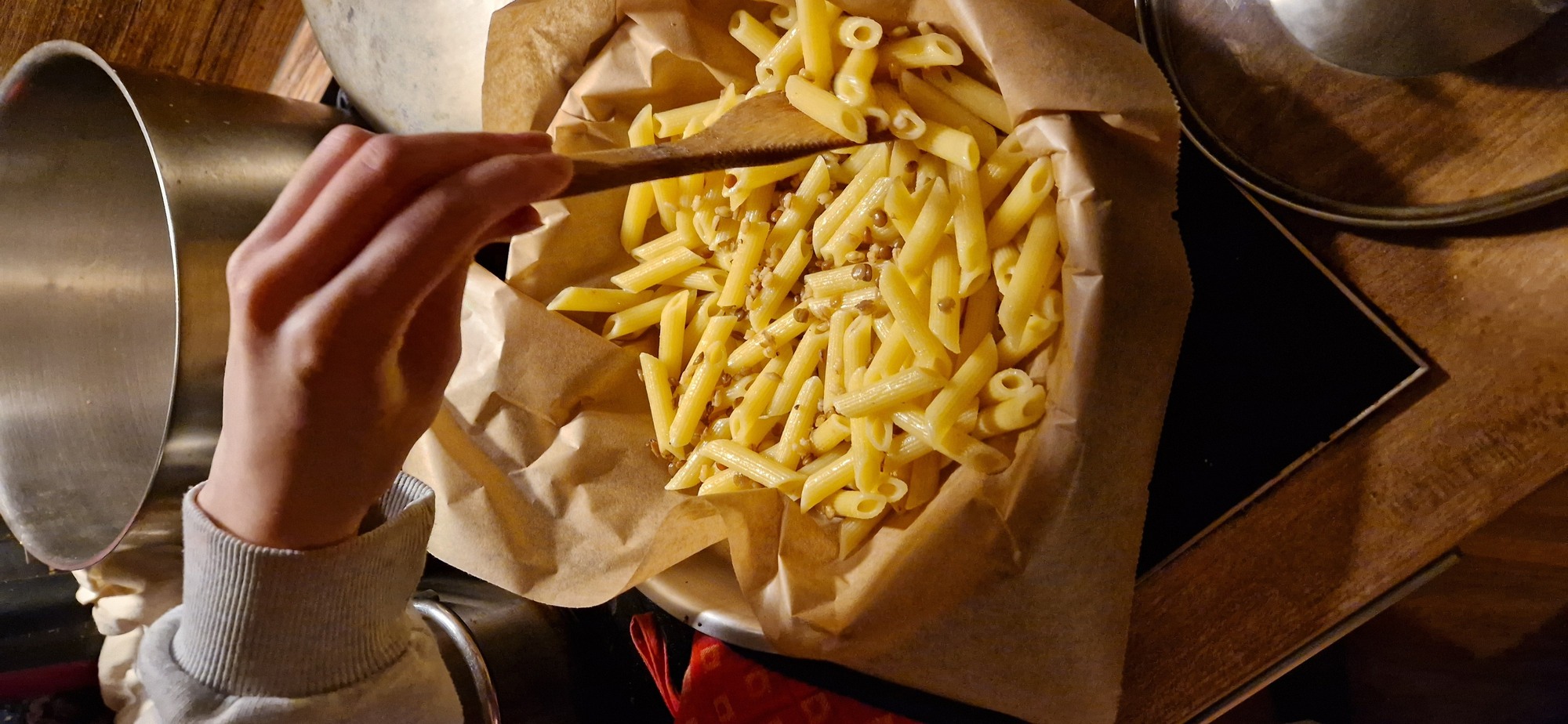 - Cook pasta in salted water al dente (about 8 min.), drain and let drip dry.