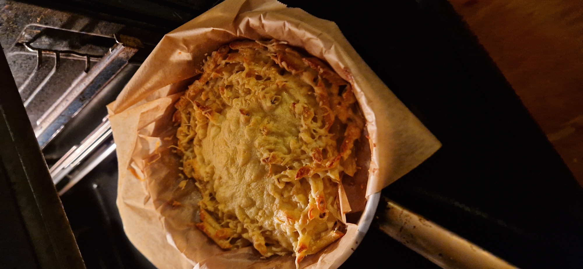 - Layer pasta and tomatoes in a greased baking dish (about 20x20 cm), pour egg-cheese mixture over top.