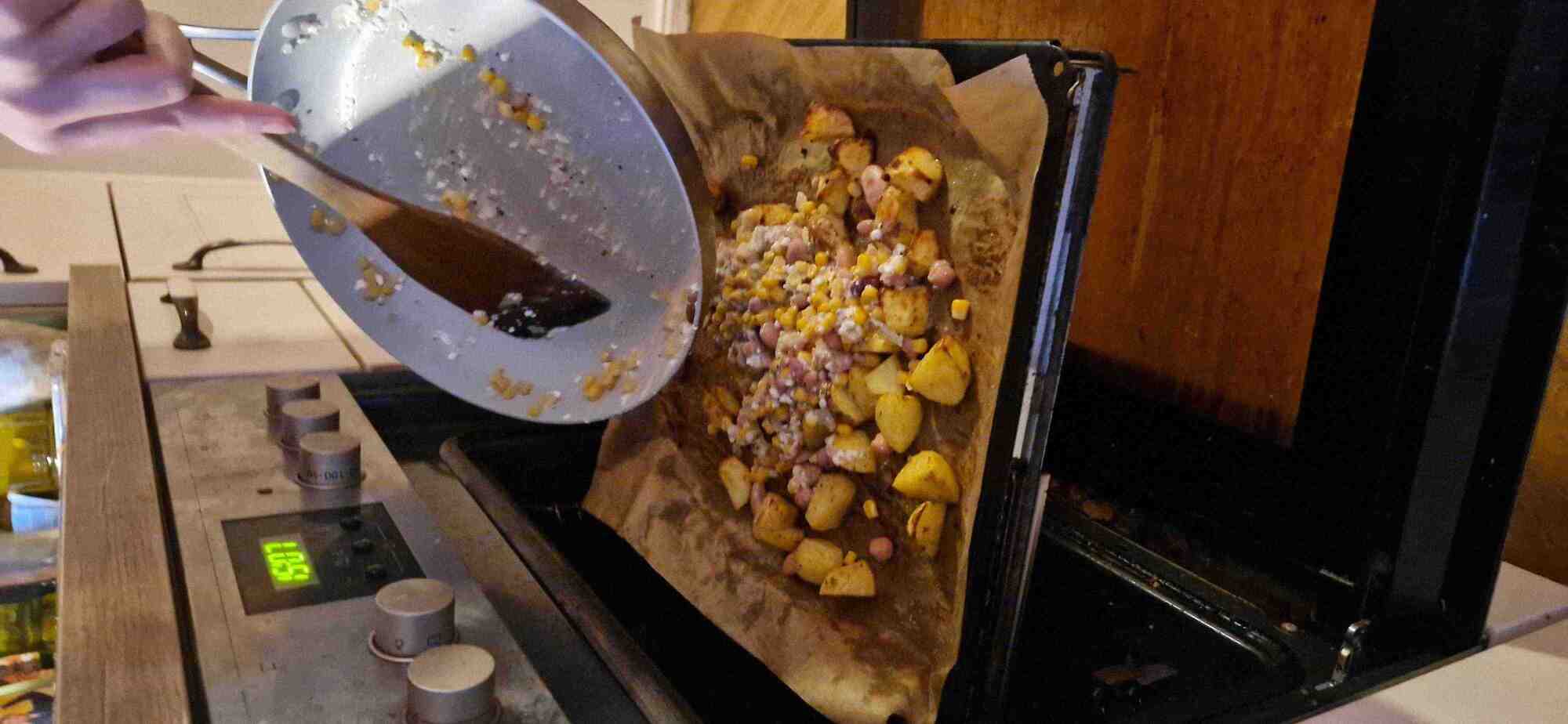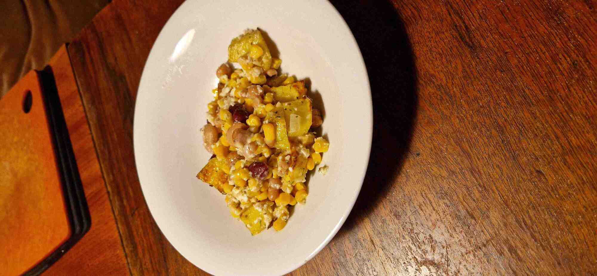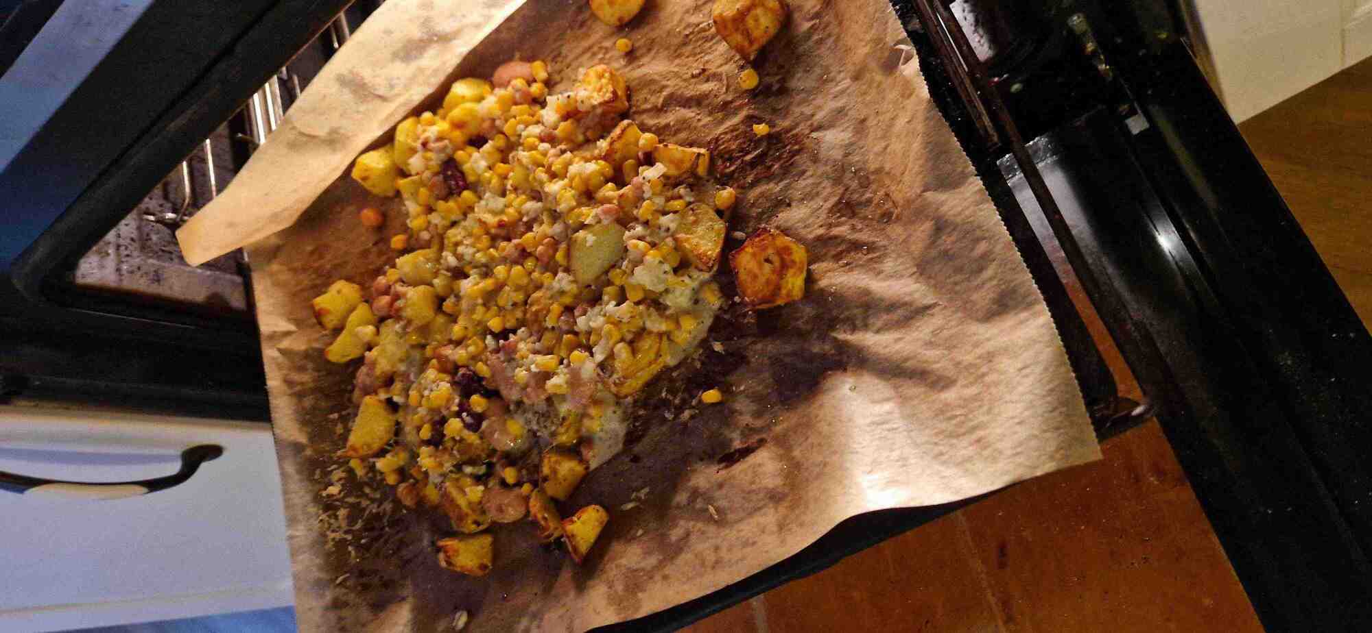Crispy oven-baked potatoes topped with gently sautéed onions and garlic, sweet corn, kidney beans, a light crème fraîche sauce and melted cheese for a filling but not too heavy meal with a slow blood sugar response.