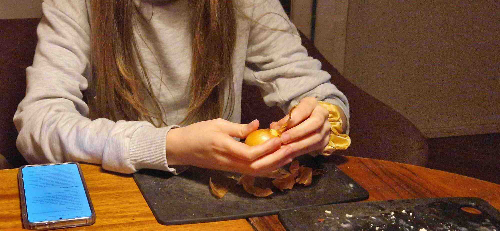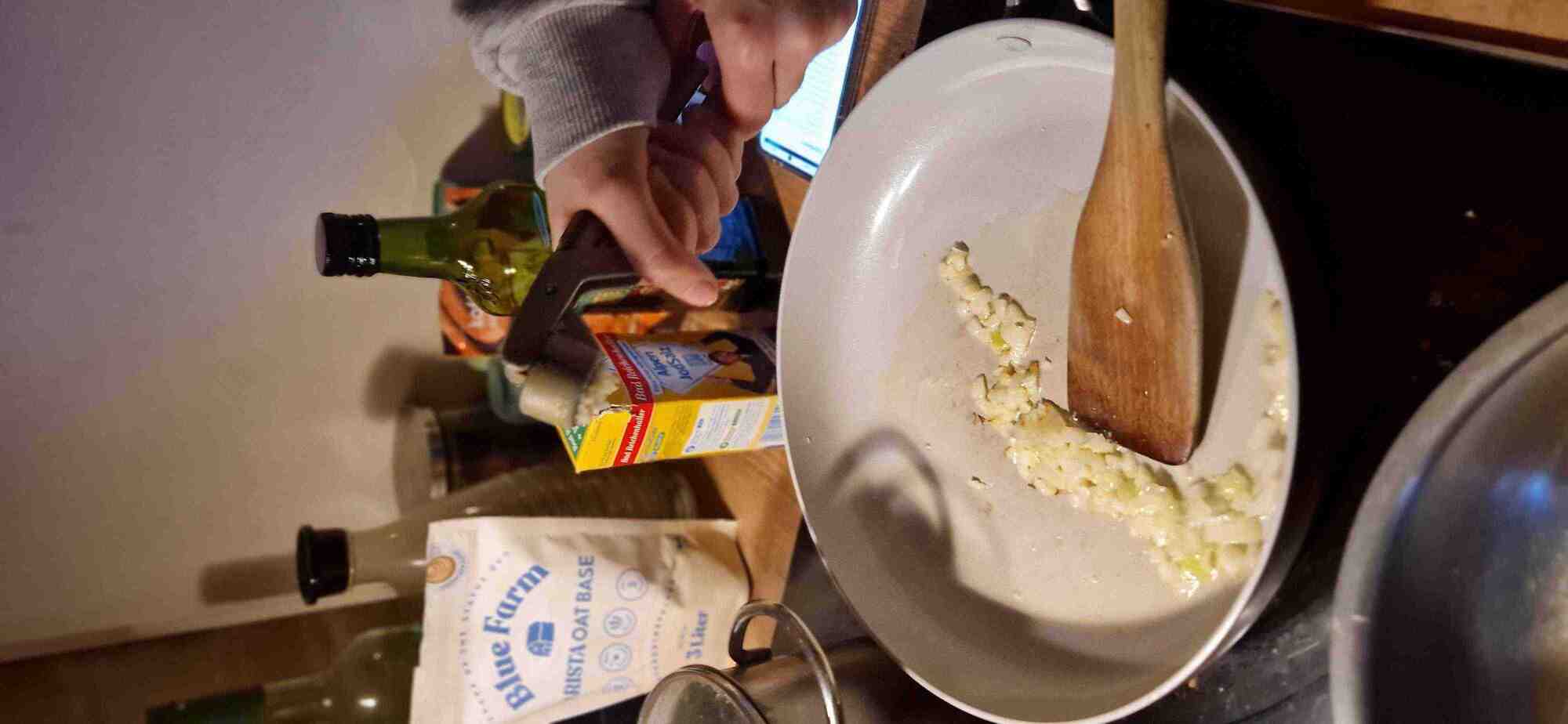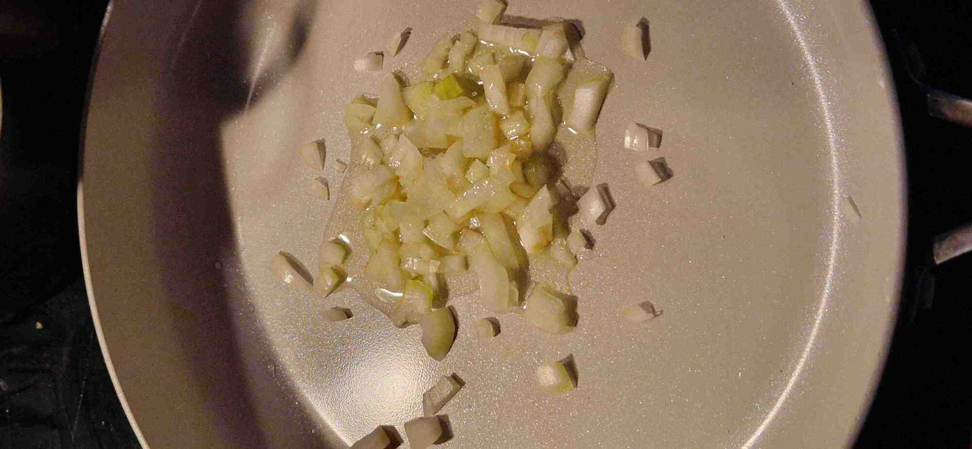 - While potatoes bake, warm a nonstick pan. Sauté onion with a pinch of salt 6 to 8 minutes until soft. Add garlic for 30 seconds.