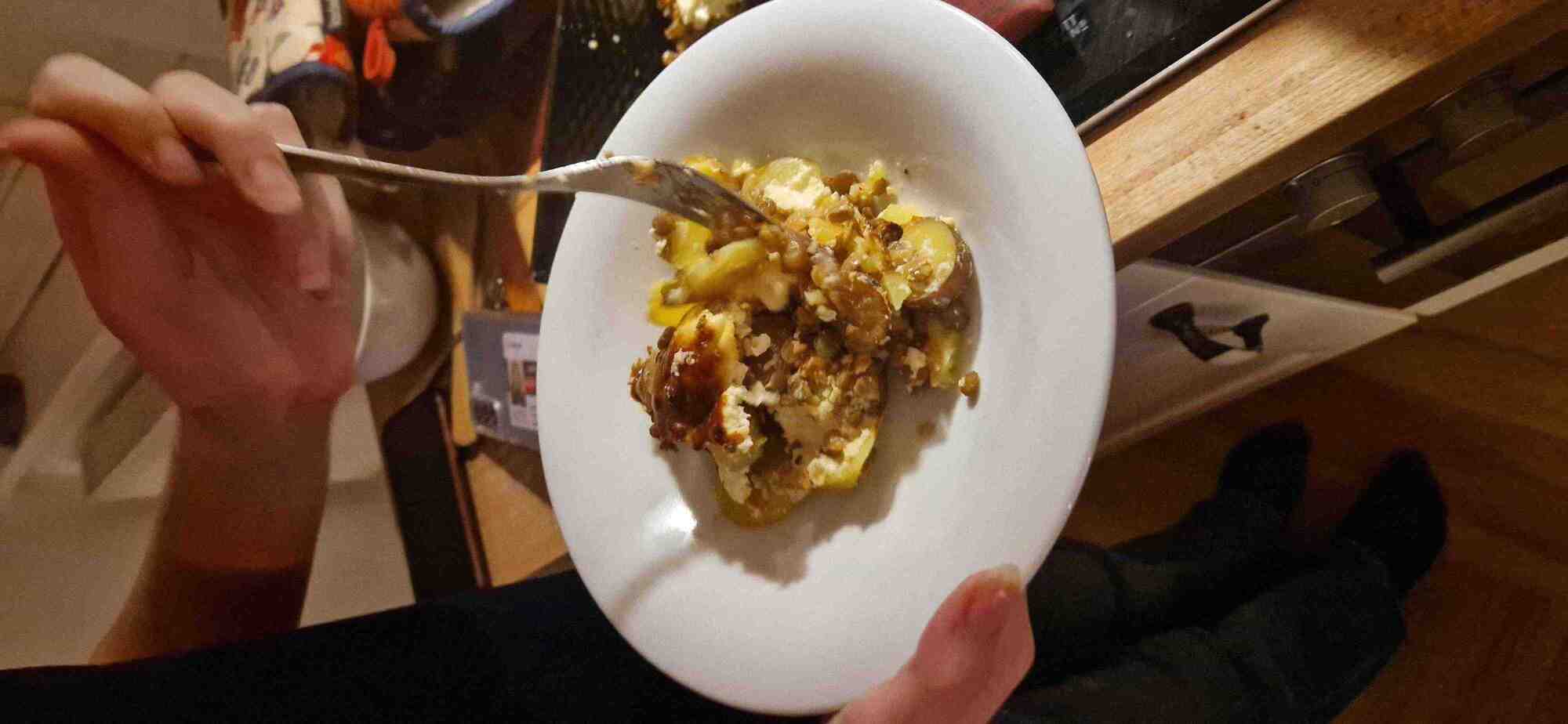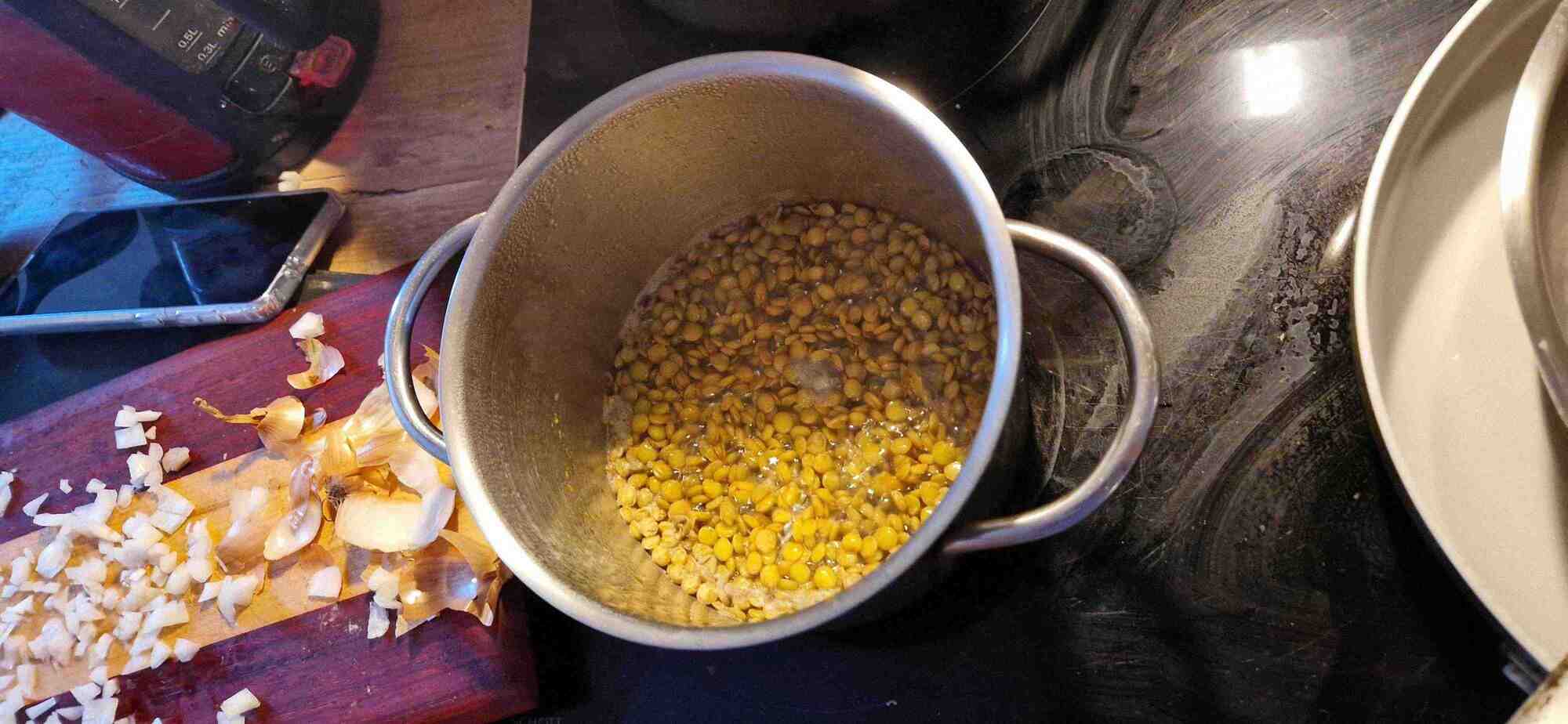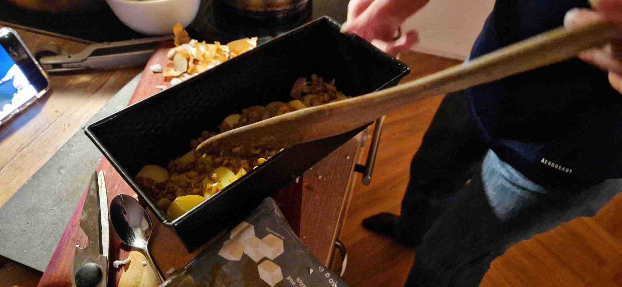 - In a small baking dish (for one serving), layer half the potato slices, then the lentil mixture, and top with remaining potatoes.