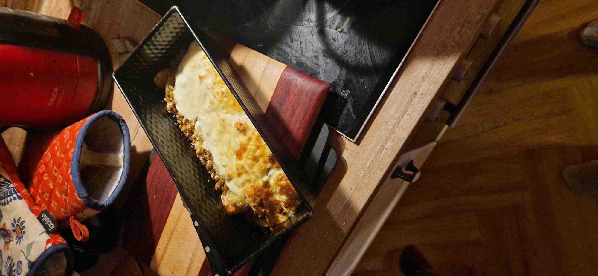 A hearty vegetarian Balkan-inspired moussaka layered with sliced potatoes, lentils, and a creamy yogurt-egg topping, baked until golden.