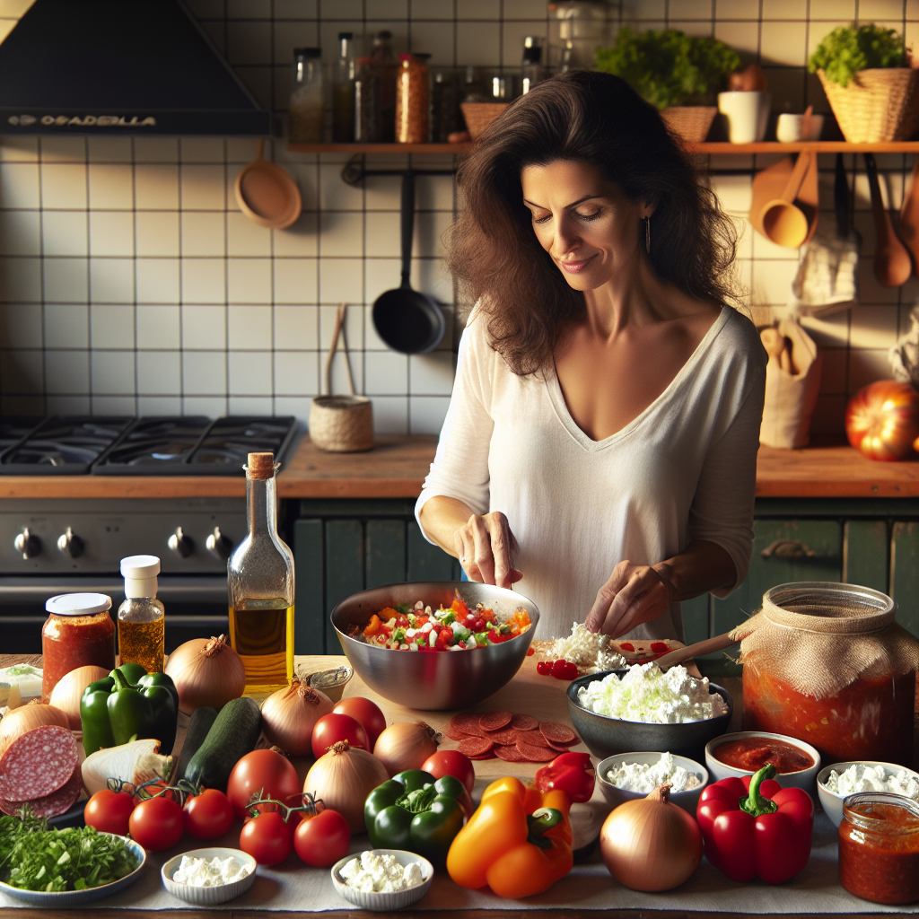 Isabella cooking Macedonian recipes with: Peppers, Tomato Sauce, White cheese, Tomatoes, Onions, Olive oil, Pepperoni, Olives, Feta cheese, Ayvar, etc